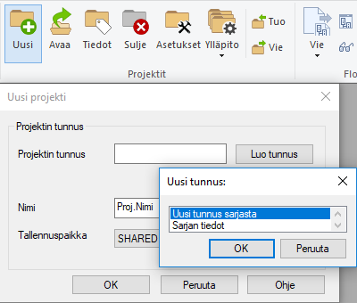 Projektit perustetaan projektitoimintojen alta löytyvän Uusi-toiminnon avulla. Projektin perustamisen yhteydessä määrität projektille tunnuksen joko käsin tai alustamalla tunnuksen numeroinnin Vertex ED:n sisäisellä numerointiautomaatilla.