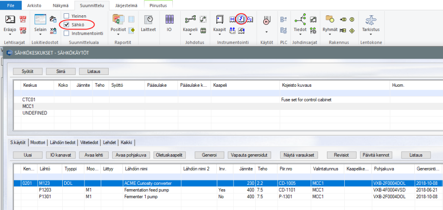 Käytöille annetaan piirien tavoin tarpeelliset tiedot ja generointia varten pohjakuva ja valintaohje. Käytöt voidaan tuoda järjestelmään halutusta Excel-taulusta ja jakaa omalla toiminnollaan haluttuihin keskuksiin. Sähkökäyttöjen osalta tämä on siis myös generointinäkymä.
