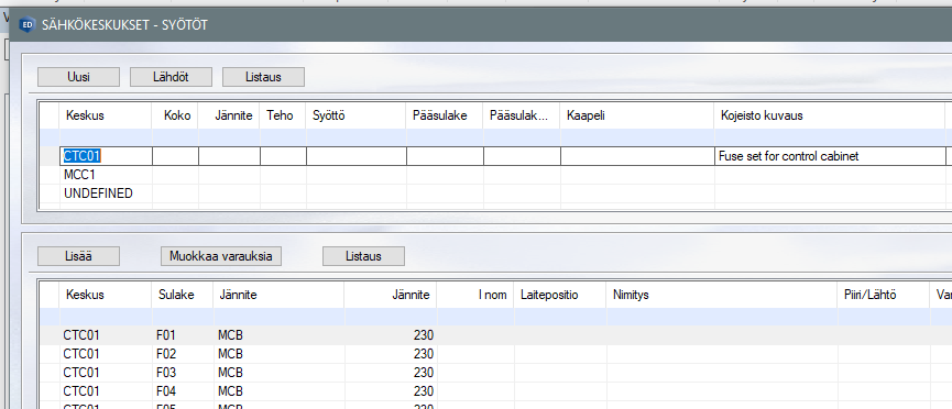 Sähkönjakokeskusten luettelossa esitellään jakokeskukset ja kuhunkin kuuluvat lähdöt sekä sähkönsyötöt. Valitusta näkymästä riippuen näkymässä on joko lähdöt tai syötöt. Sähkösyötöt lisätään keskukseen manuaalisesti (vrt. ilmansyötöt)