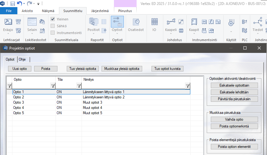 Uusi optiojärjestelmä on automaattisesti ja oletuksena aktiivisena versiosta 2025 alkaen. Toiminnallisuuden käyttöönotto ei edellytä ohjelman lisensseihin muutoksia.