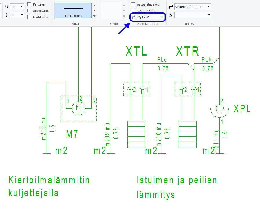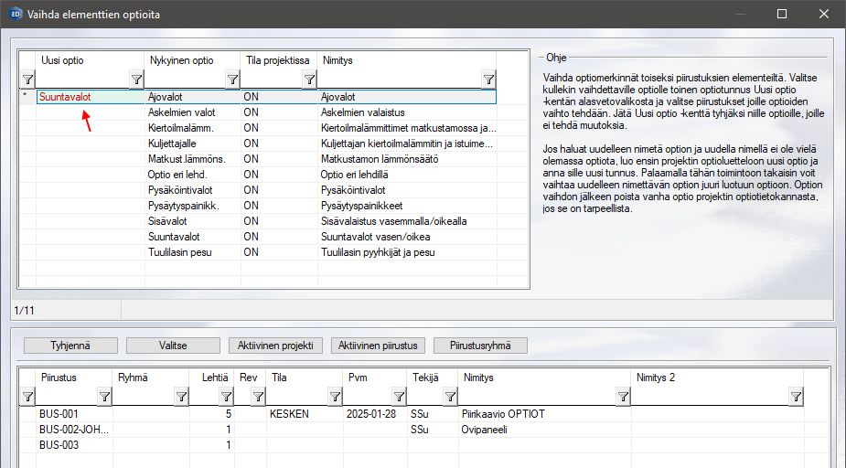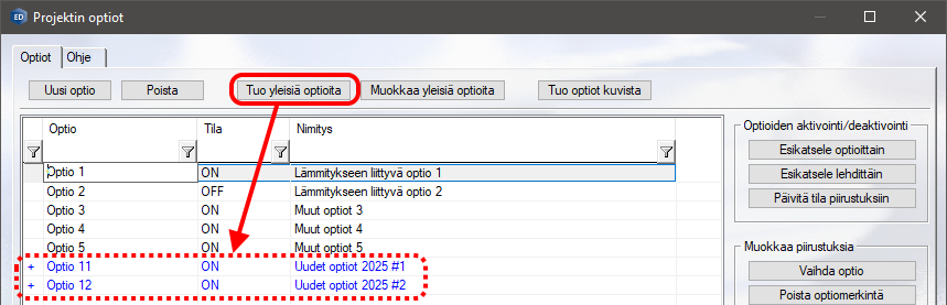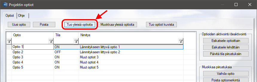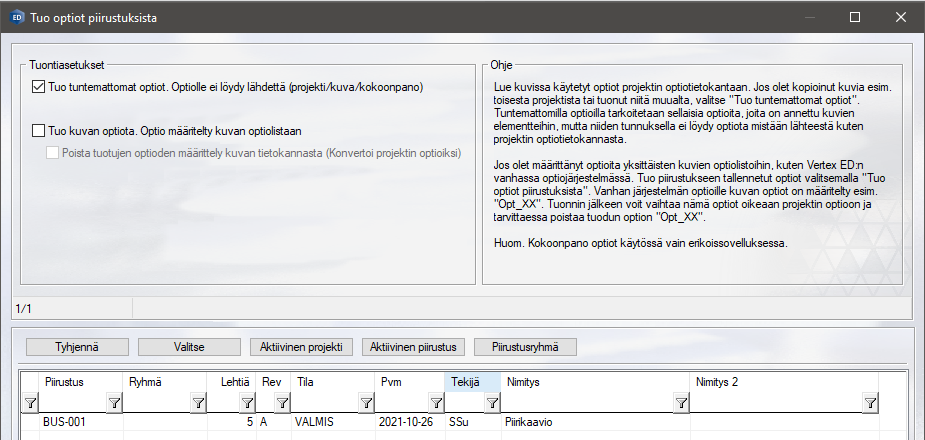 Piirustuksista voidaan tuoda kuvissa käytettyjä optioita projektin optiotietokantaan. (ks. oheinen info oikea ylälaita)