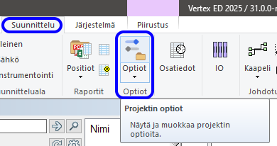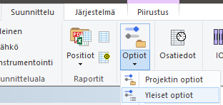 Uusi Optiot-toiminto (Projektin optiot) sijaitsee Suunnittelu-välilehdellä.