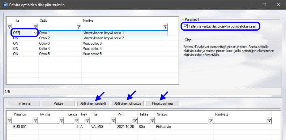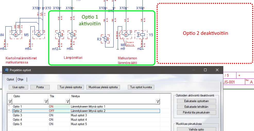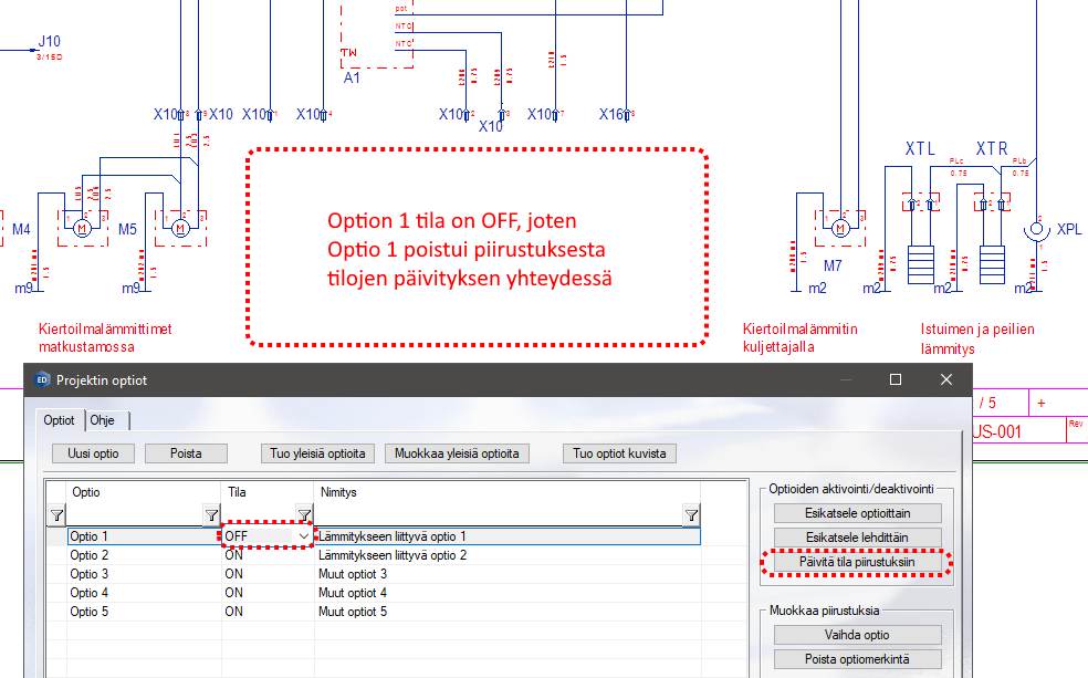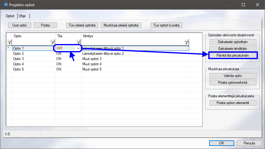 Option aktiivituus voidaan poistaa (ON → OFF). Tämän jälkeen optioiden mukainen tila voidaan päivittää piirustuksiin eli optio 1 häviää.
