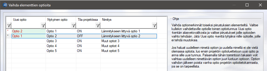Elementtien optioita voidaan vaihtaa optiosta toiseen. Esimerkiksi Optio 1 → Optio 2 ja Optio 2 → Optio 1.
