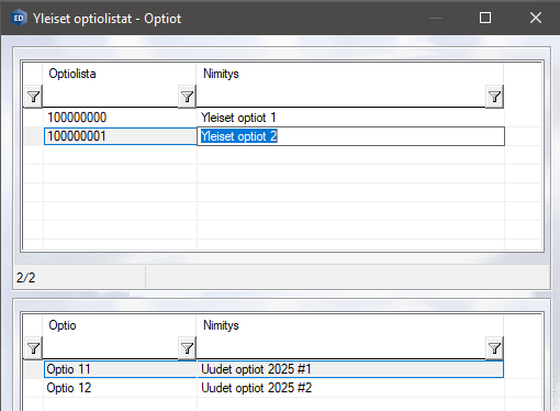 Yleiset optiolistat. Optiolista 100000001 “Yleiset optiot 2” sisältää kaksi optiota: Optio 11 ja Optio 12.