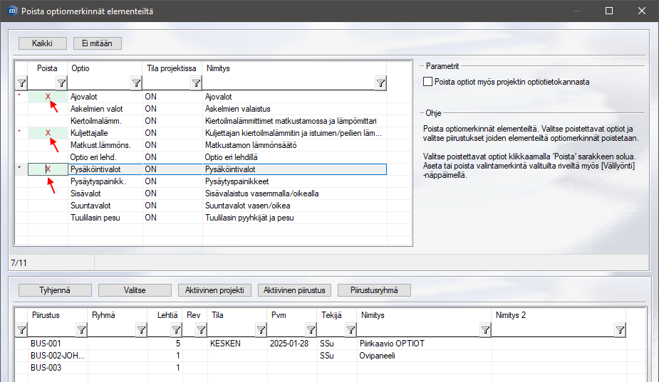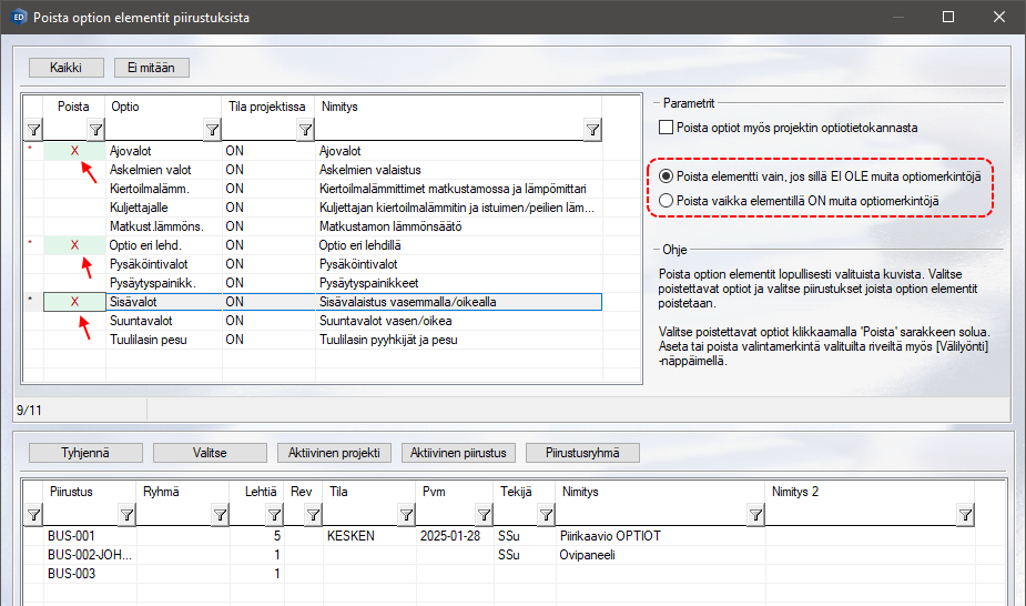 Kuvaelementeiltä voidaan myös poistaa optiomerkinnät hallitusti “Poista optiomerkintä”-toiminnon avulla. Dialogissa valitaan ne optiot, joiden merkinnät halutaan poistaa niihin kuuluvilta kuvaelementeiltä. Muutoksen jälkeen kuvaelementit eivät siis enää kuulu tiettyyn optioon.