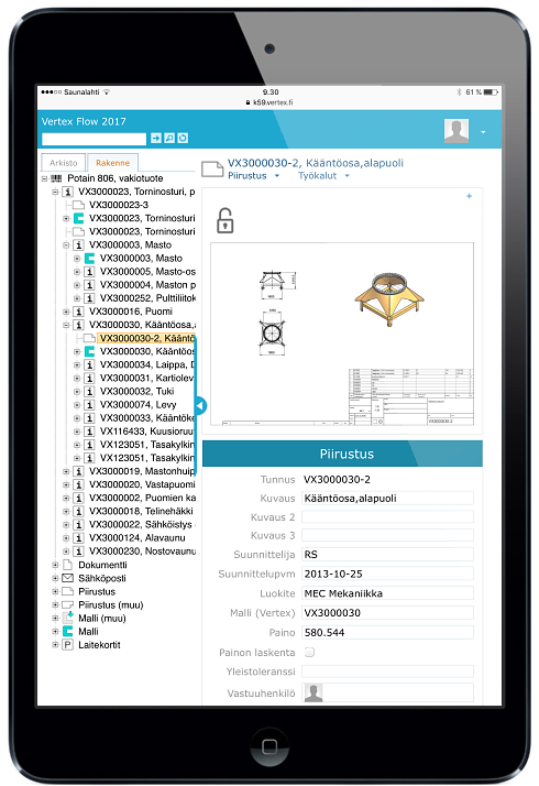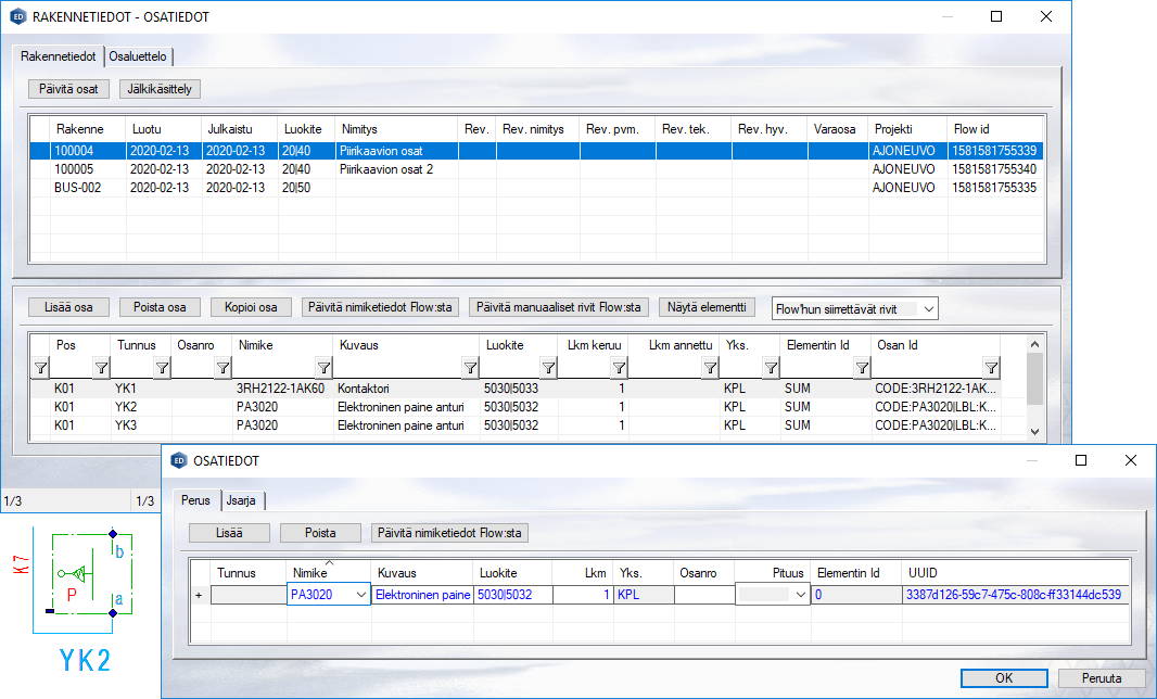 Piirustuksiin syötetään laitetietoja suoraan Flow-nimikkeistä. Lisäksi luodaan rakenteet, joille haetaan syötetyt nimikkeet esim. piirustus- tai positiokohtaisesti.