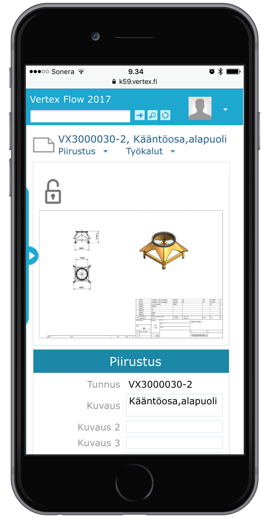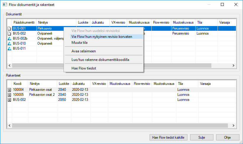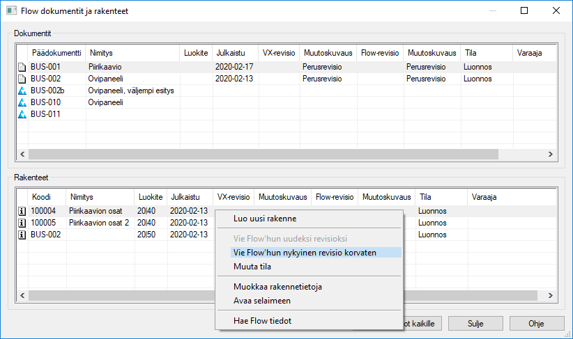 Piirustusten rakenteet nimikkeineen viedään Flow'hun.