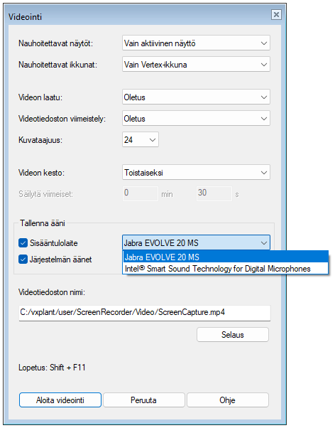 Äänilähteenä voi olla mikrofoni tai järjestelmän äänet. Voit itse valita mitä sisääntulolaitetta käytät.