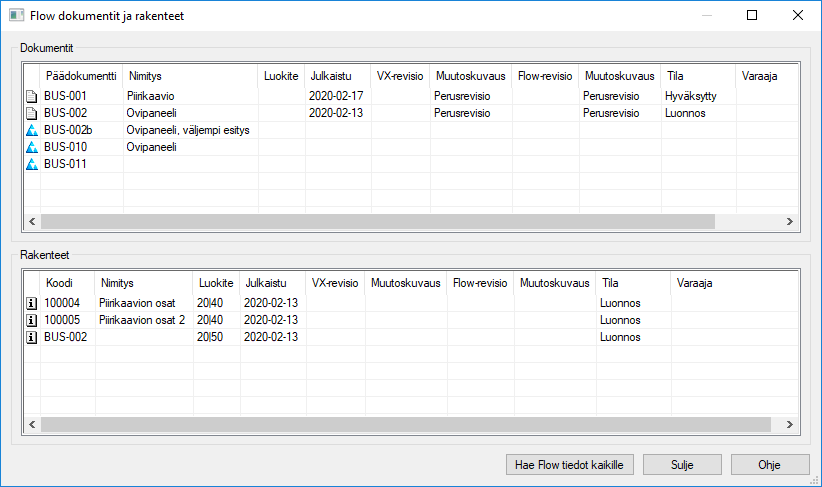 Dialogissa on kaksi taulukkoa, joista ylemmässä käsitellään projektin dokumentteja ja alemmassa niiden rakenteita. Kaikki toiminnot löytyvät näiden taulukoiden tilannevalikoista, eli hiiren toisen napin takaa aukeavasta valikosta. Valikon toiminnoista on valittavissa vain sellaiset toiminnot, jotka ovat mahdollisia valituille riveille. Muut toiminnot ovat harmaannutettuja. Tähän vaikuttavat mm. Flow -objektin tila ja käyttäjän oikeudet. Taulukossa näytetään sekä Vertex -tietokannoissa että Flow’ssa olevia tietoja. Näytettävät kentät voidaan määritellä setup-asetuksilla.