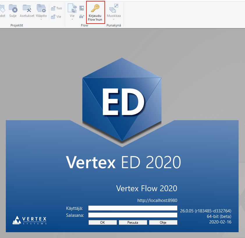 Vertex Flow:n käyttöönotto edellyttää yhteysasetusten määrittelyä ja sisäänkirjaantumista Vertex ED/HD -ohjelmien käyttöliittymästä käsin.