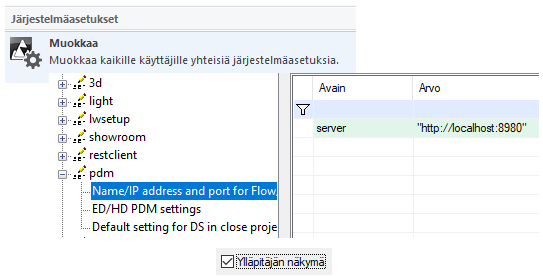 Järjestelmäkohtaisen, kaikkia käyttäjiä koskevan Flow-yhteyden käyttöönotto tapahtuu Vertex ED/HD:n Järjestelmäasetusten kautta, Tiedosto - Asetukset - Järjestelmäasetukset - Muokkaa -valintojen takaa, valintalistauksen pdm-kohdasta. (ks. kuva)