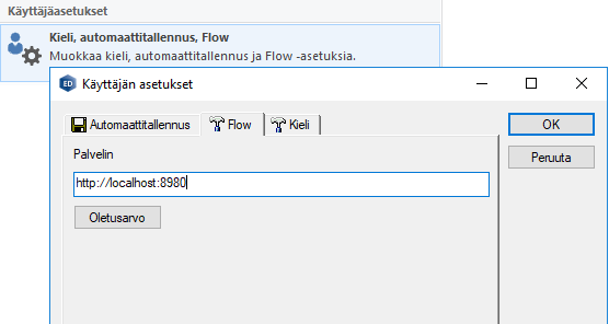 Käyttäjäkohtainen Flow-yhteyden käyttöönotto onnistuu Vertex ED/HD:n käyttäjäasetusten kautta, Tiedosto - Asetukset - Käyttäjäasetukset - Kieli, automaattitallennus, Flow -valintojen takaa omalta Flow-välilehdeltään. Oletusarvo-painike palauttaa Palvelin-kenttään Järjestelmäasetuksiin kirjatun Flow-palvelimen osoitteen.