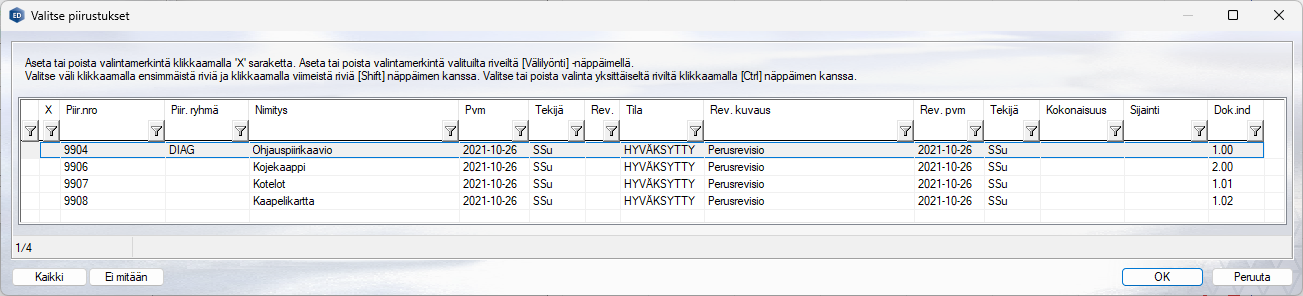 Uusi piirustusten valintaan käytettävä dialogi