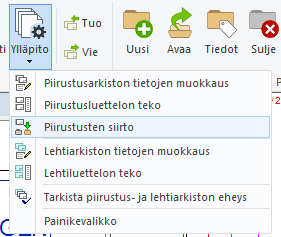 Piirustusten siirto -toiminto tekee paluun Arkisto-välilehdelle. (Arkisto - Dokumentit - Ylläpito - Piirustusten siirto)
