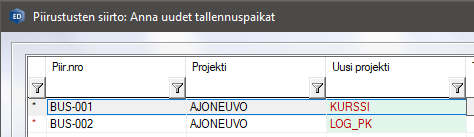 Valitaan mihin projektiin tai projekteihin piirustukset siirretään.