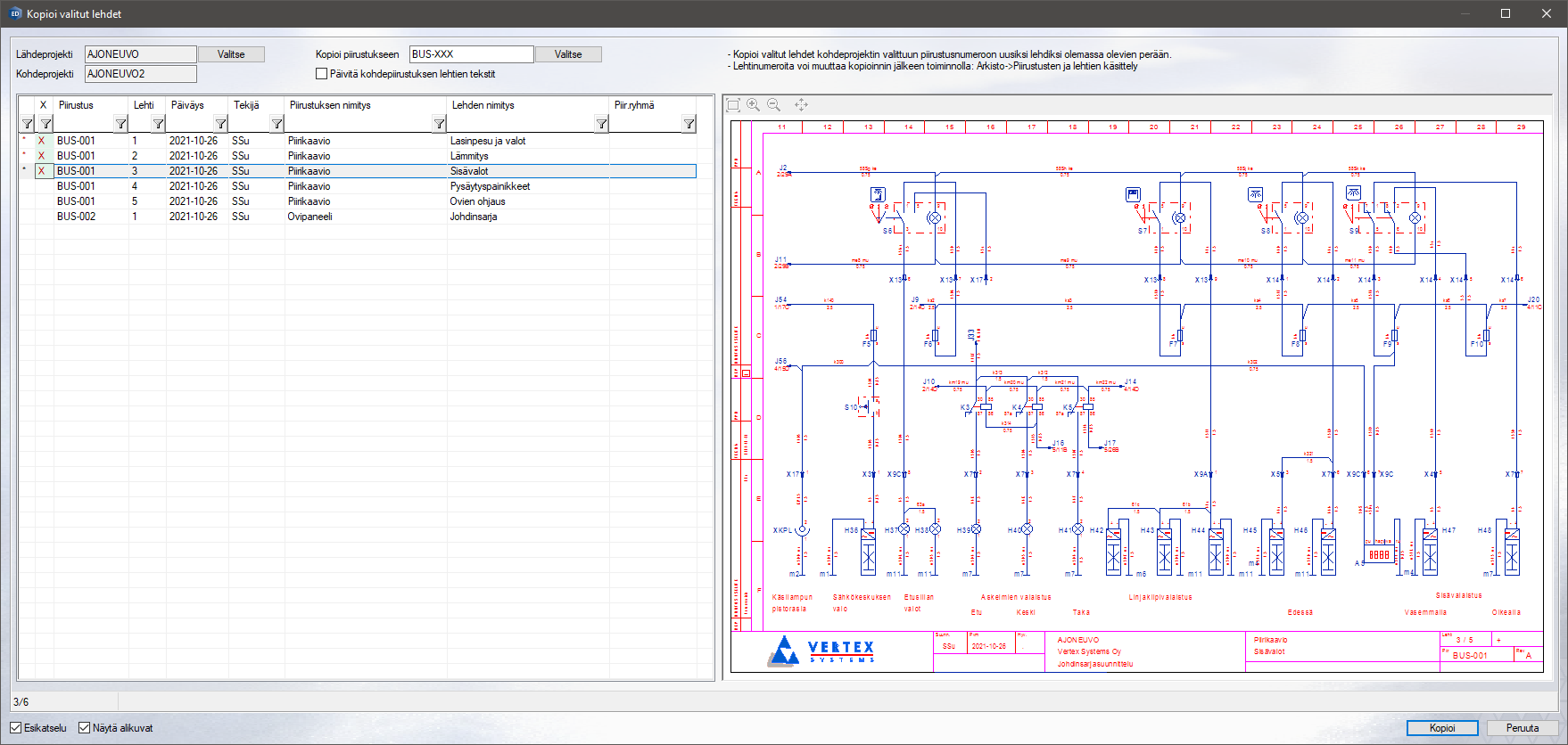 Esimerkki: Toimintoon valitaan lähdeprojekti, josta yksittäisiä piirustuslehtiä kopioidaan. (Kuvassa lähdeprojekti AJONEUVO) Lisäksi määritetään kohdeprojekti, joka on taustalla auki oleva aktiiviprojekti (kuvassa AJONEUVO2) sekä se piirustusnumero kohdeprojektin alta, johon piirustuslehtiä kopioidaan. (Kuvassa BUS-XXX). Sen jälkeen valitaan ne piirustuslehdet, jotka kopioidaan BUS-XXX -piirustusnumeron alle lisäämällä lehdille valintamerkintä