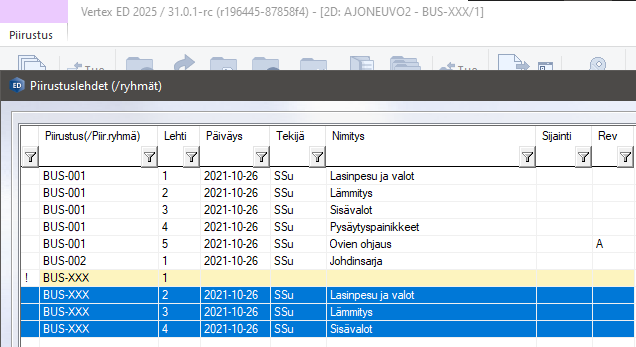 Kopioidaan kolme ensimmäistä lehteä AJONEUVO-projektista AJONEUVO2-projektin piirustukseen BUS-XXX. Huomaa valintamerkinnät X.