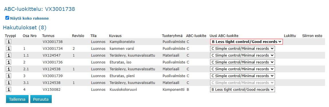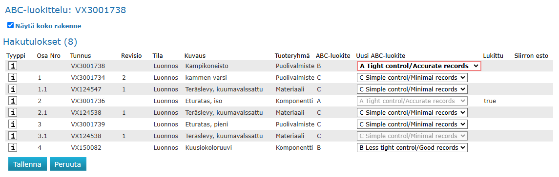 Näytä koko rakenne -valinnalla saat näkyviin koko tuoterakenteen (myös nimikkeet, joiden ABC-luokitteessa ei ole muutostarvetta).