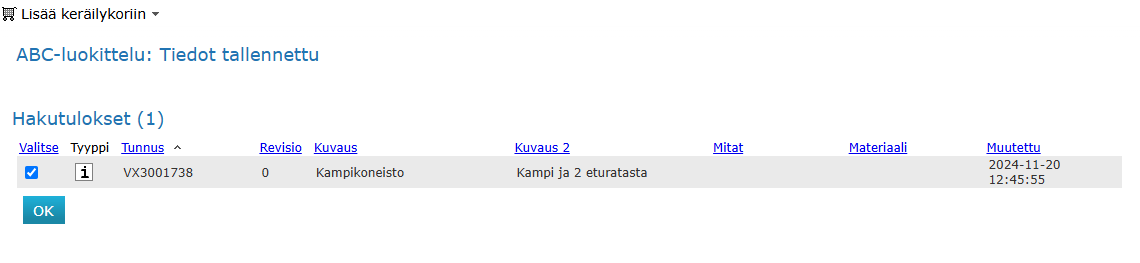 Tallennuksen jälkeen voit viedä muuttuneet nimikkeet haluttuun keräilykoriin Lisää keräilykoriin -toiminnolla.