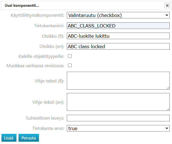 Tyyppi: Valintaruutu (checkbox), Tietokanta-arvo: true