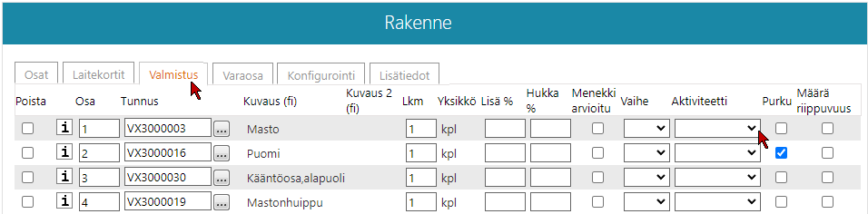 Aktiviteetteja voi lisätä varattuun nimikerakenteeseen Rakenne-lohkon Valmistus-välilehdelle.