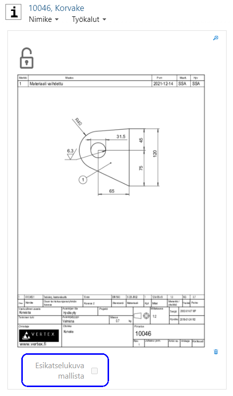 Oletuksena nimikkeen esikatselukuva käytetään piirustuksen esikatselukuvaa, mutta nimikekohtaisesti voidaan nimikkeelle valita mallin esikatselukuva.