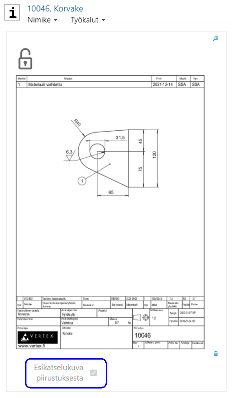 Voit asettaa nimikkeen esikatselukuvaksi siihen liittyvän piirustuksen esikatselukuvan.