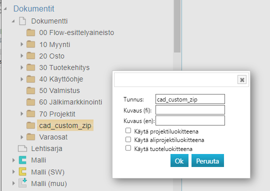 Lisää järjestelmään uusi luokite tunnuksella cad_custom_zip, Luo uusi dokumentti Flow'n selainkäyttöliitymän avulla ja aseta sen luokitteeksi cad_custom_zip. Liitä dokumentin tiedostoksi edellä luotu vxcustom.zip.