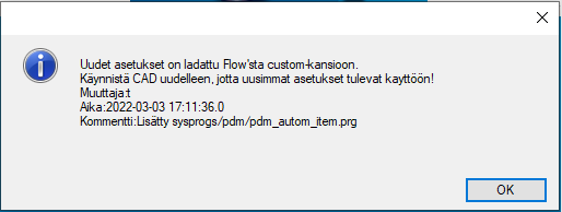 Koska uusi custom-kansio ladataan vasta Flow'hun kirjautumisen jälkeen, on G4 ehtinyt ottamaan käyttöön edelliset asetukset. Siksi custom-kansion latauksen jälkeen tulee kehoitus käynnistää G4 uudelleen, jotta uusimmat asetukset tulevat käyttöön.