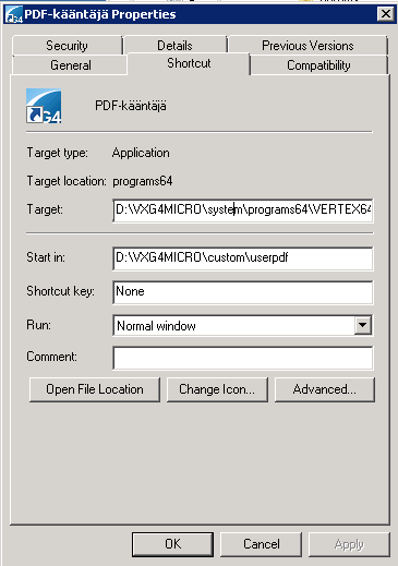 - Kirjoita avainsanaan Target polku taustakääntäjä-G4:n päähakemiston system\programs\vertex64.exe -hakemistoon, ks. kuva alla.