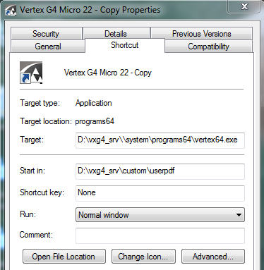 - Kirjoita avainsanaan Target polku G4 (g4_srv) päähakemiston system\programs64\vertex64.exe -hakemistoon, ks. kuva alla