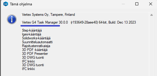 CAD-taustakääntäjän ohjelmatiedoissa on G4:n ohjelmatyypin oltava Task Manager ja optiolisensseissä mukana tarvittavat käännösformaattilisenssit: