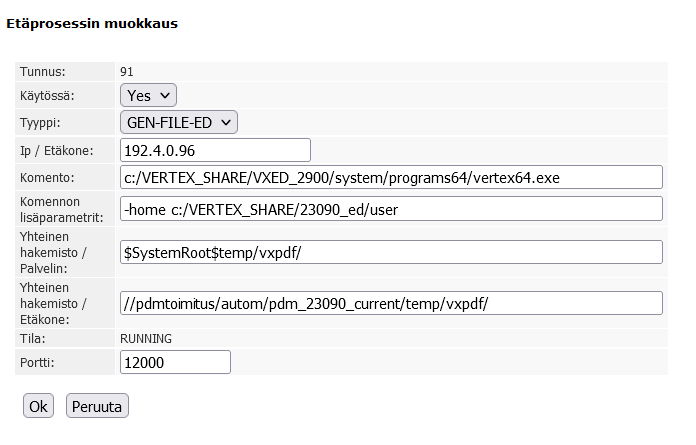 Jos haluat päivittää myös Vertex ED:ssä ylläpidettävien lehtisarja-tyyppisten dokumenttien otsikkotaulut, määrittele Vertex ED taustakääntäjäksi seuraavasti (huomaa tyyppi GEN-FILE-ED):