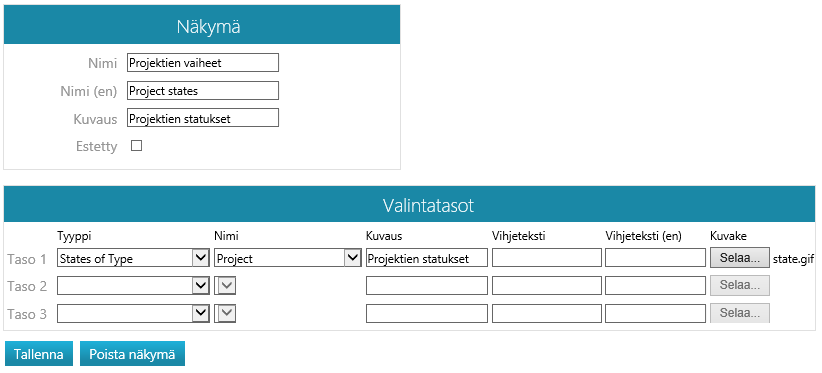 - Syötä näkymän selväkielinen nimi suomeksi ja englanniksi.