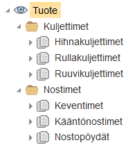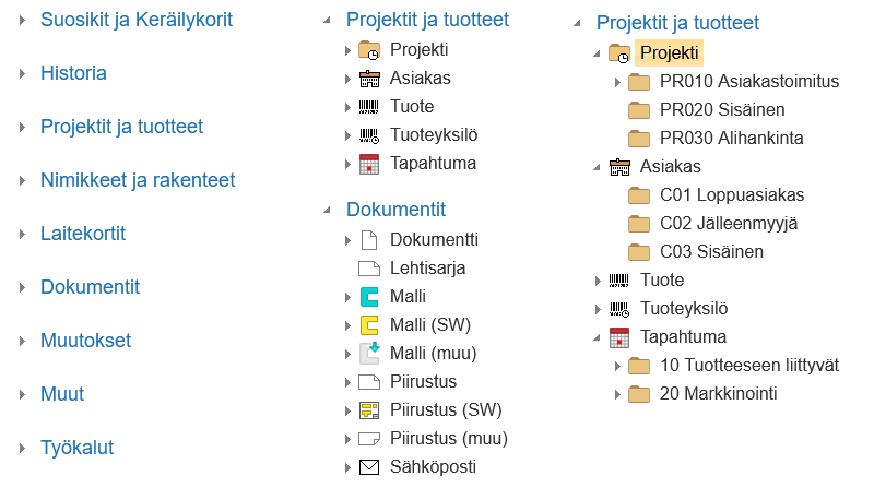 Objektit on ryhmitelty, joten napsauta ryhmä (esim. Projektit ja tuotteet) ensin auki, jotta pääset valitsemaan objektityypin (esim. Projekti tai Tapahtuma).