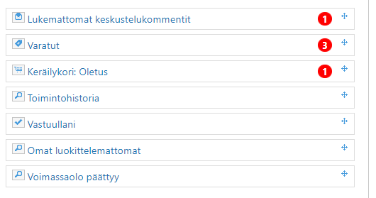 Työpöydän lohkoista (Lukemattomat keskustelukommentit, Varatut, Vastuullani ja Keräilykori) pääset katsomaan esimerkiksi kommentteja, joita et ole vielä lukenut, käyttäjätunnuksellesi varattuja dokumentteja, suosikkikeräilykorisi sisältöä, toimenpiteitä odottavia dokumentteja jne.
