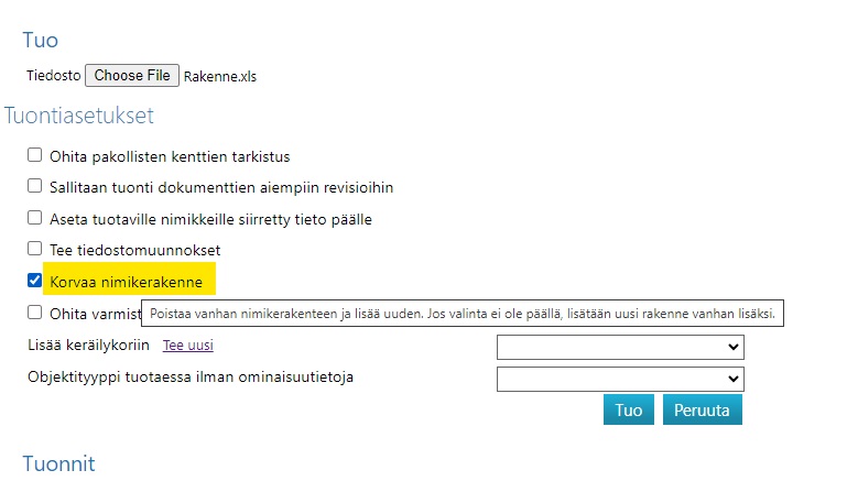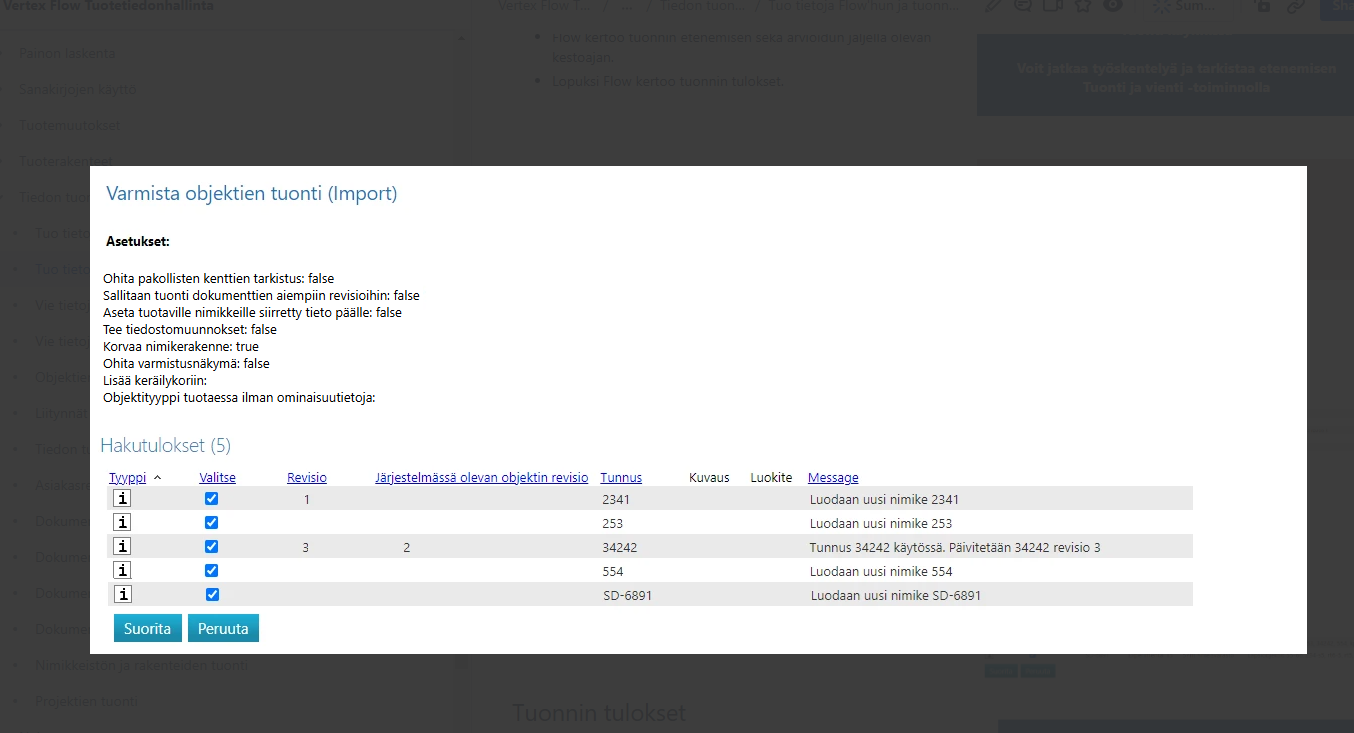 Näet listasta, mitä objekteja ollaan tuomassa uutena ja mitkä päivittävät olemassa olevia objekteja. Voit estää yksittäisten objektien tuonnin ennen tuontitoiminnon kuittausta.