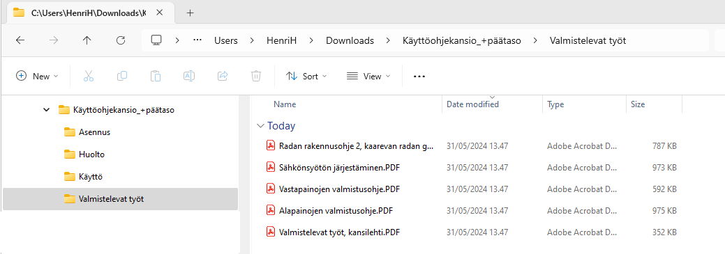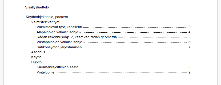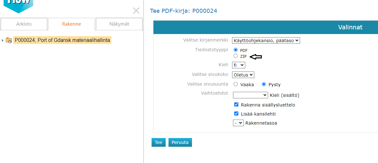 Katso kuva valinnasta PDF/ZIP. Katso kuva, jossa on esimerkkiprojektin PDF-kirjan sisällysluettelo. Katso kuva vastaavasta zip-tiedoston rakenteesta. Lue lisää ohjeesta.