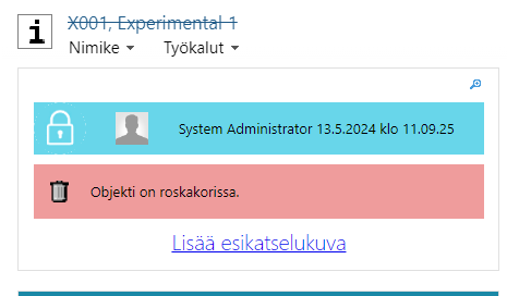 Objektikortti: roskakorissa oleva objekti merkitty selkeästi