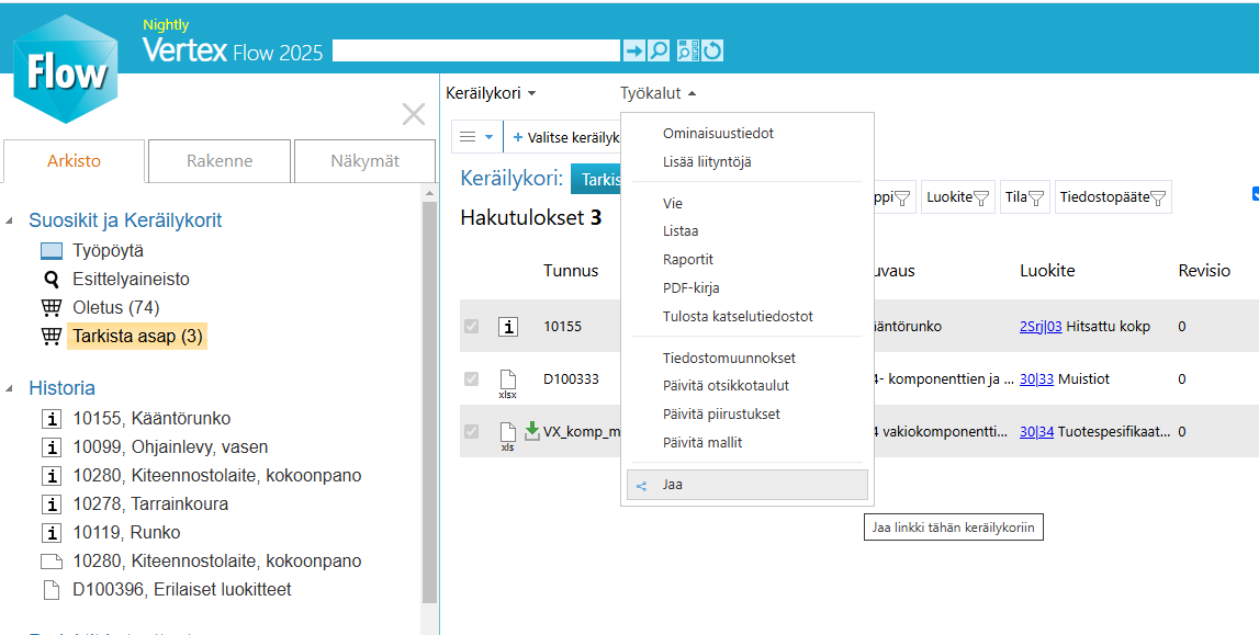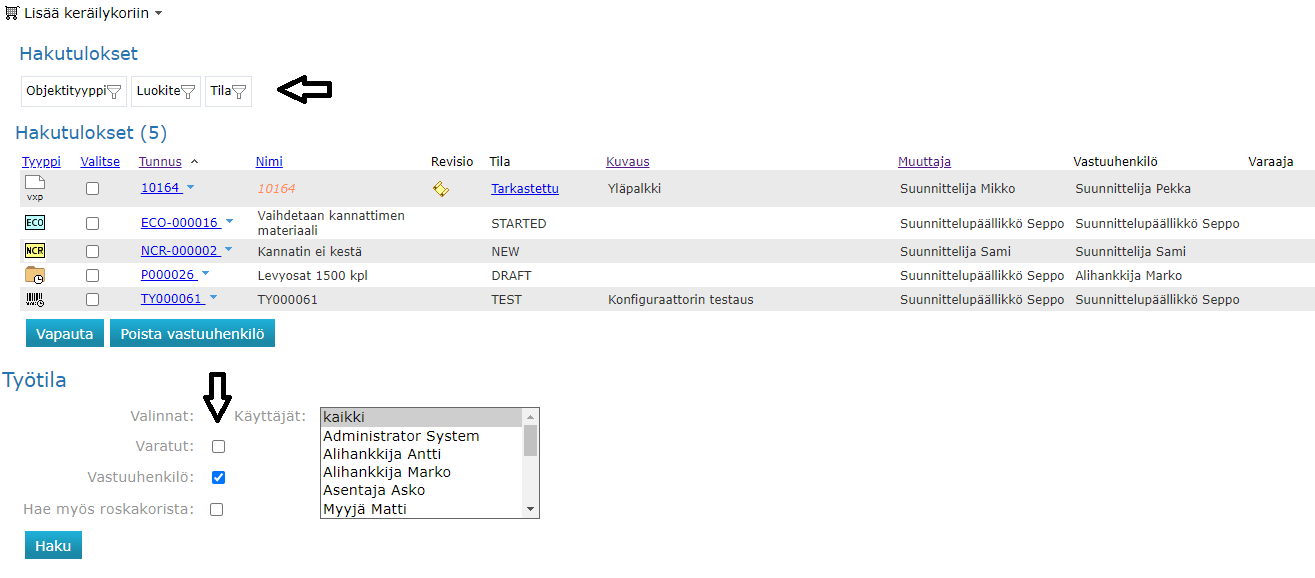 Työkalut > Työtila -sivun käyttökokemusta on parannettu lisäämällä siihen suodattimet. Lisäksi valintaruutujen asetukset jäävät muistiin.
