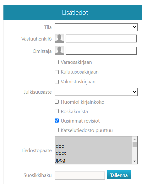 Voit hakea ja suodattaa dokumentteja päätiedoston nimen päätteen (.xls, .xlsx, .vxm jne) mukaan.