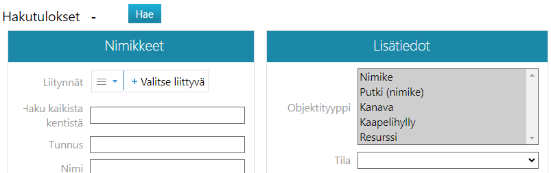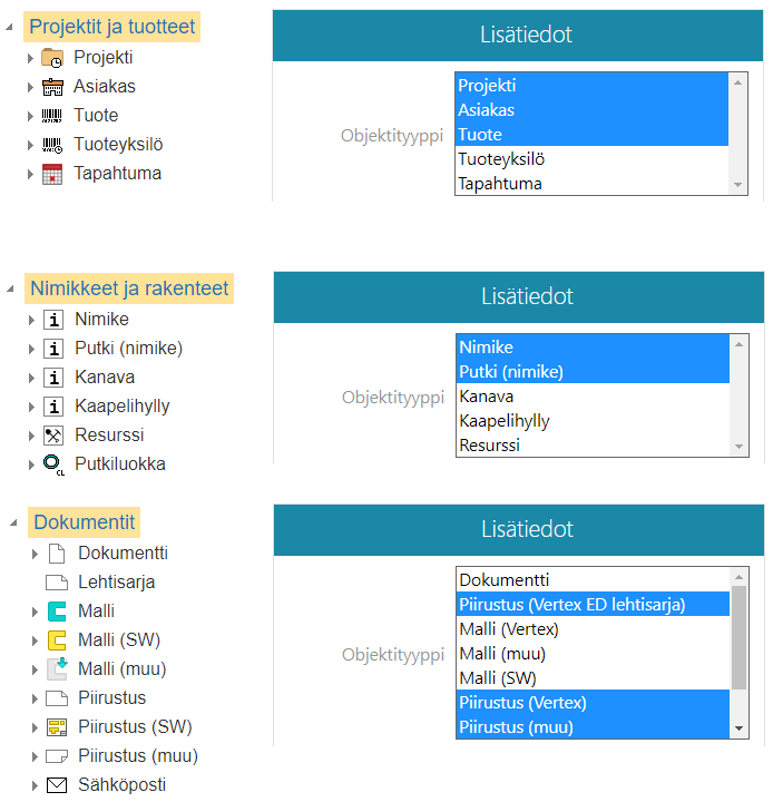 Voit hakea kaikkia objektiryhmän sisällä olevia objekteja tai voit valita ryhmän sisältä objektityyppejä, joita haluat hakea.