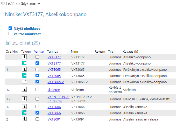 Flow listaa nimikerakenteeseen liittyvät mallit ja piirustukset, mutta piilottaa nimikkeet.
