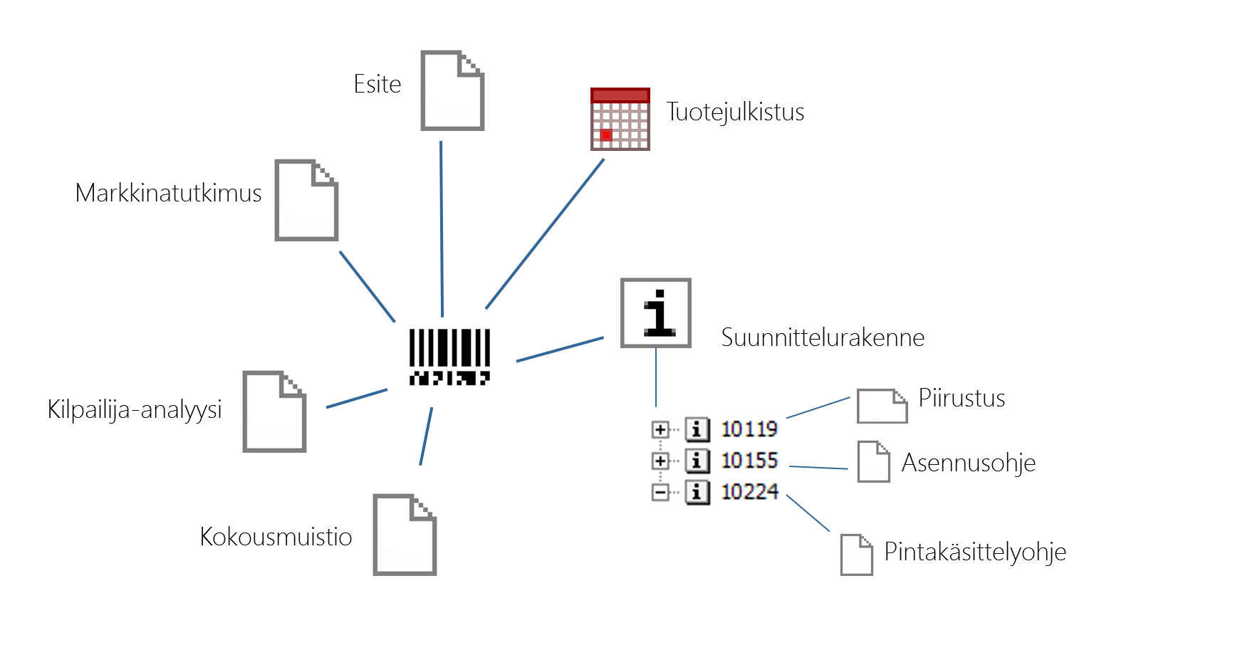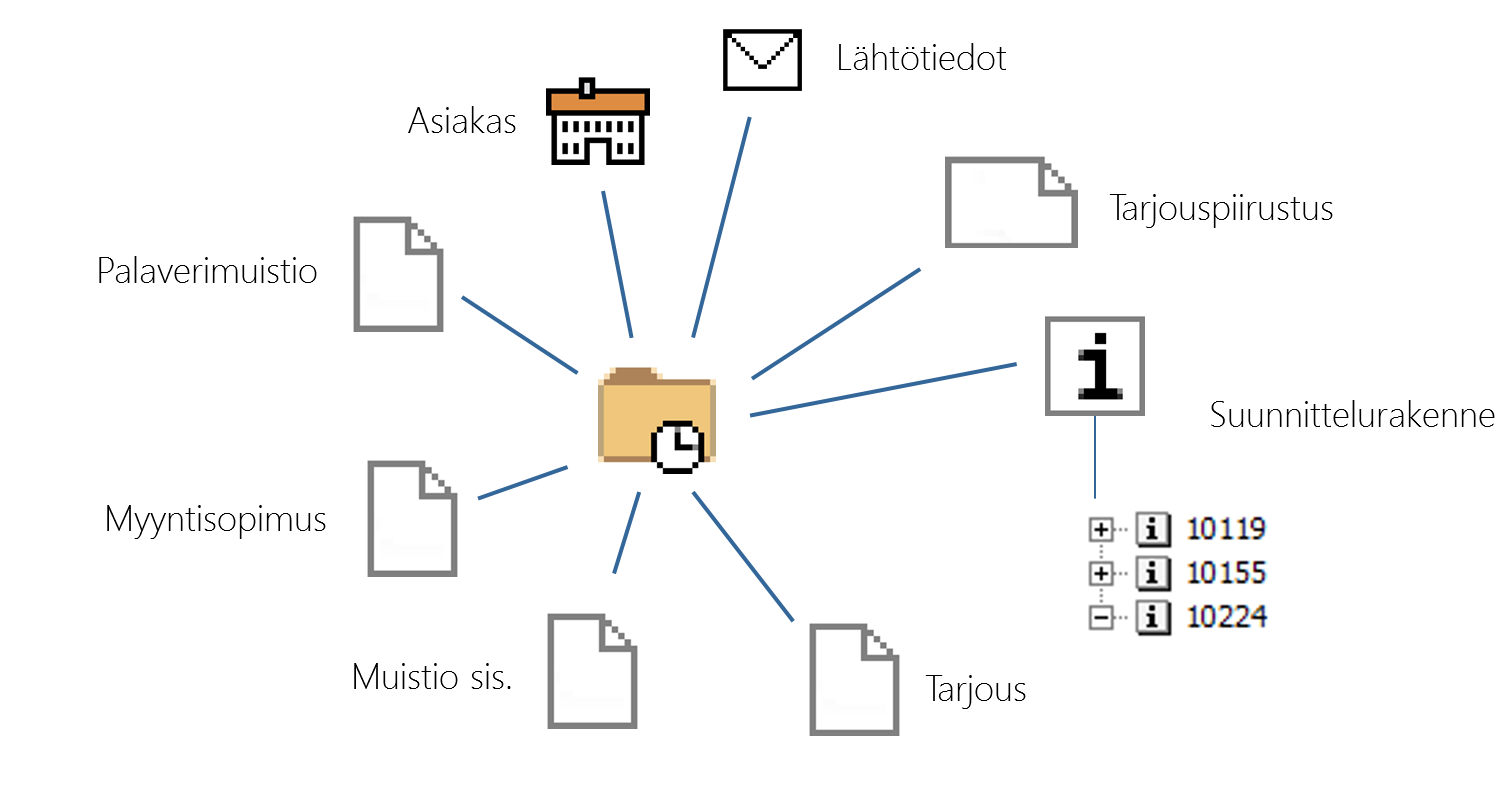 Liitynnät muodostavat asiayhteyksien ketjun. Tämä on oleellinen ominaisuus objektien etsimisessä ja syy-seuraussuhteiden jäljittämisessä. Jos etsitään nimikettä, se voidaan löytää liittyvän projektin avulla. Projekti taas löytyy, kun löydetään asiakas, jolle projekti on myyty. Kun asiakkaan kortille on tehty liitokset niihin projekteihin, jotka asiakkaalle on myyty, löydetään näiden joukosta myös etsittävä projekti. Suositeltava käytäntö on, että projektin yhteydessä asiakkaalle toimitettu nimike on liitetty projektiin. Nimikkeitä on projektissa useimmiten vain yksi.
