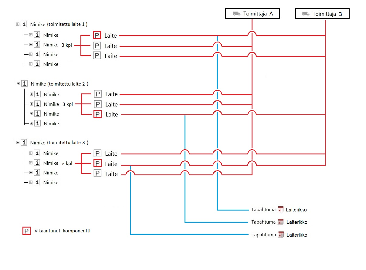 - Kuvassa punaisella liitynnät nimikkeiden, laitekorttien ja toimittajien välillä.