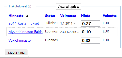 - Hintatietoja voi olla yhdelle nimikkeelle useita, esim. omakustannus-, kampanja- ja myyntihintoja eri markkina-alueille.
