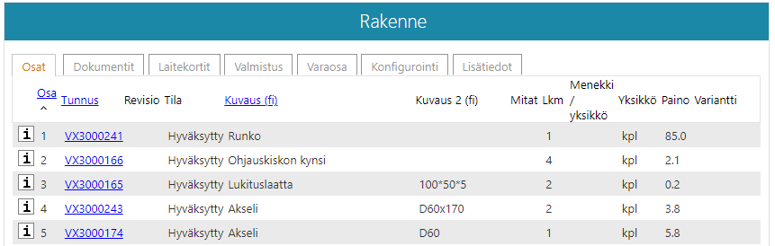 Oletusasetukset vaativat, että nimikkeen kuvaus, luokite ja yksikkötiedot on täytetty ja rakenteen osat on numeroitu nollasta poikkeavalla osanumerolla. Nämä kenttien asetukset tehdään asiakassovituksena.