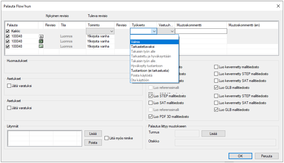 Valitse Tila-riviltä Kaikki, jos haluat muuttaa kerralla listalla näkyvän mallin ja piirustuksien tilaa tai