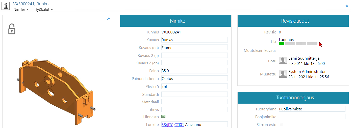 Esimerkkikuvassa on hitsattu nimikerakenne (VX3000241), joka on vielä Luonnos-tilassa.